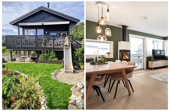 Arkitektonisk tøff funkisbolig med solrik takterrasse og usjenert hage-/terrasseområde.