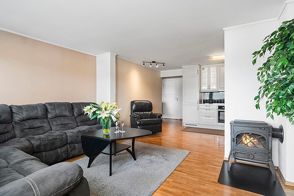 Ca. 56 m², med ett stort soverom (pusset opp i 2025). Leiligheten har ny varmepumpe (2025), varmegulv, kombinert vask/tørk, oppvaskmaskin, keramisk platetopp, ovn og komnbiskap og varmegulv
