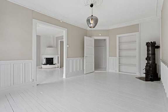 Stor, lys og romslig stue med peis ovn. Utsikt nedover Sorgenfrigata .