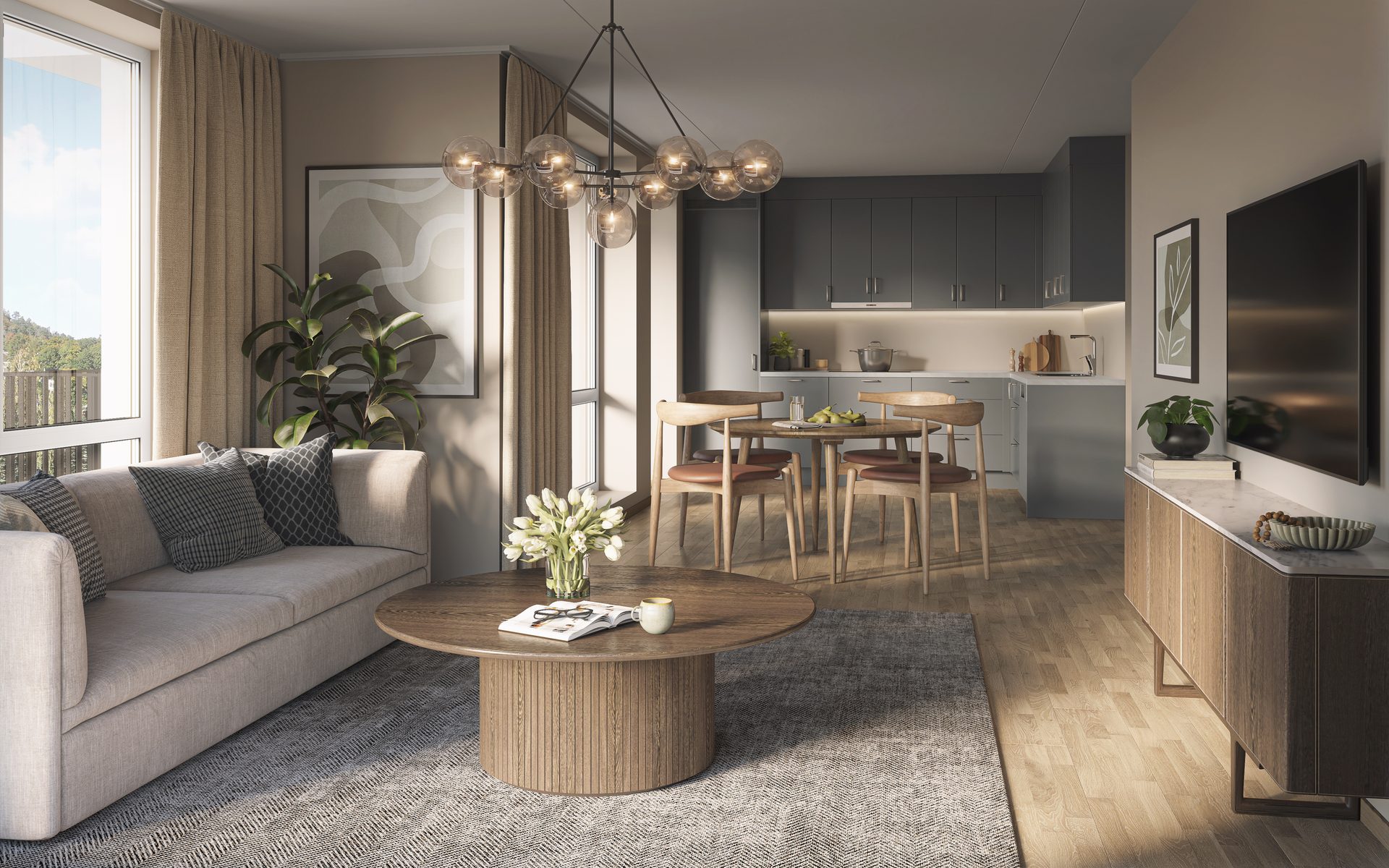 – Det er innflytting allerede i april. Vi har innredet en visningsleilighet som du er velkommen til å besøke. Leilighet 407 er en 3-roms på 90 kvm, den ligger i fjerde etasje. Den er ferdigstilt og møblert, slik at du kan få en ekte følelse av hvordan det er å bo her, sier Julie.