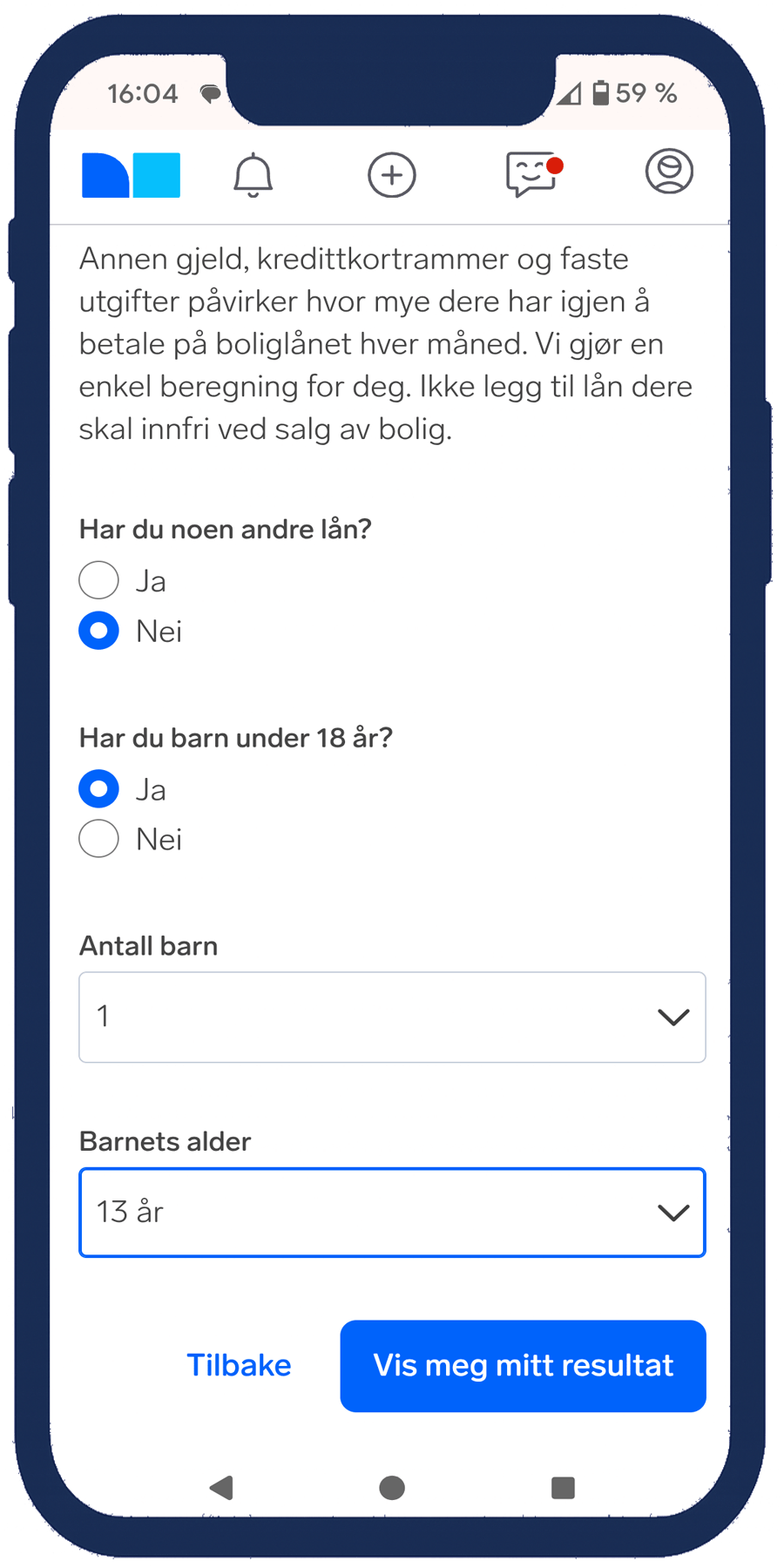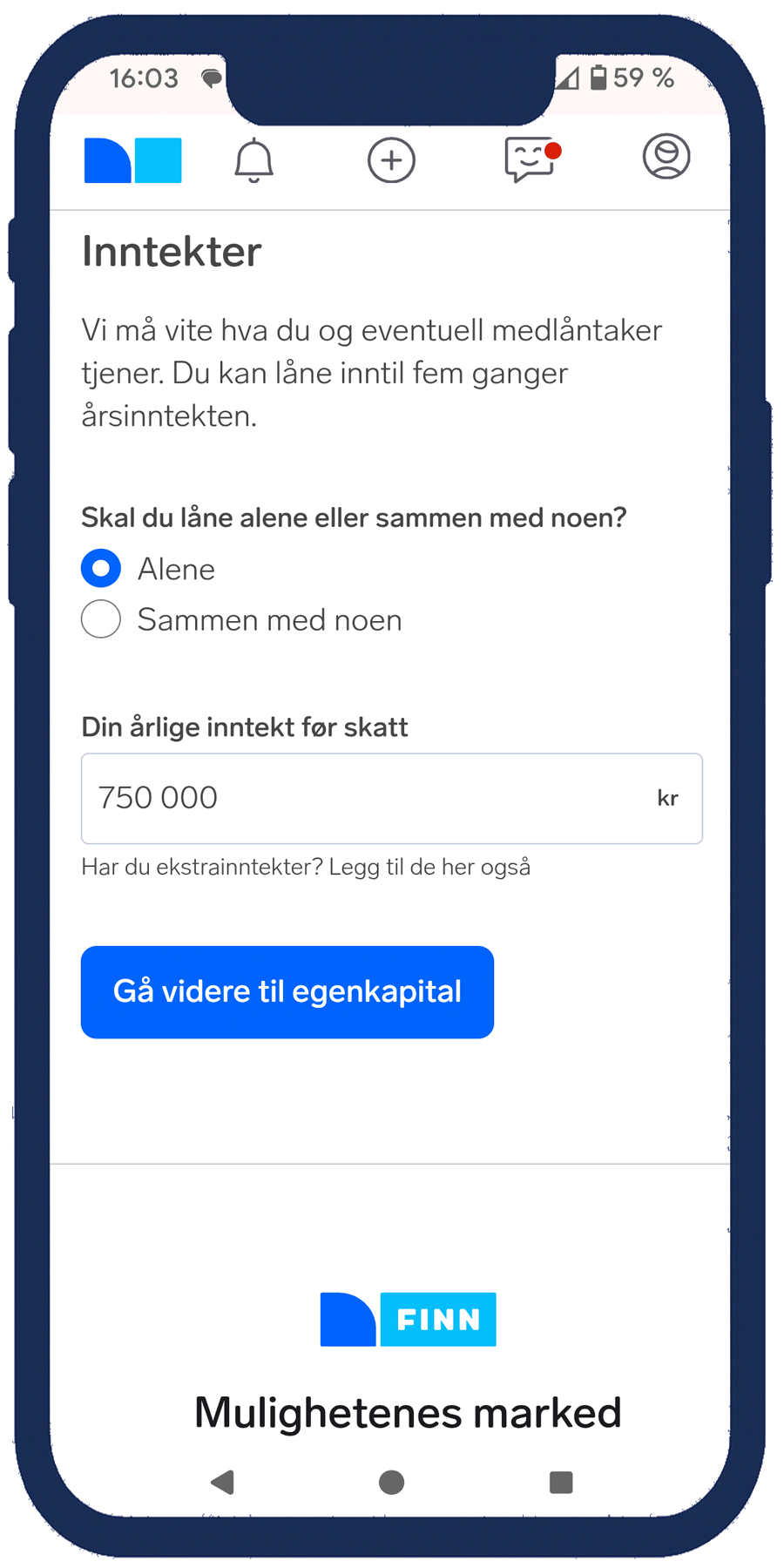 Bildekarusellen under tar deg gjennom stegene i lånekalkulatoren. Her legger du inn inntekt, egenkapital, gjeld og utgifter.