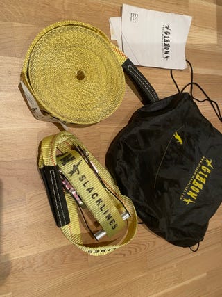Slackline slack line brukt 2 ganger. Merke Gibbon 5cm brei, 13 m lang