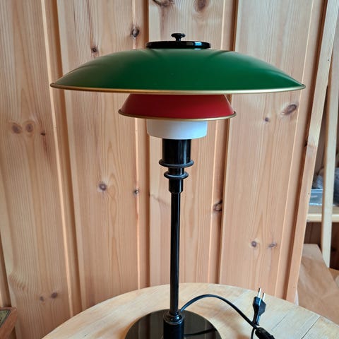 Helt ny Louis Poulsen 3/2 bordlampe med forkromet stel og skærme af opalglas.