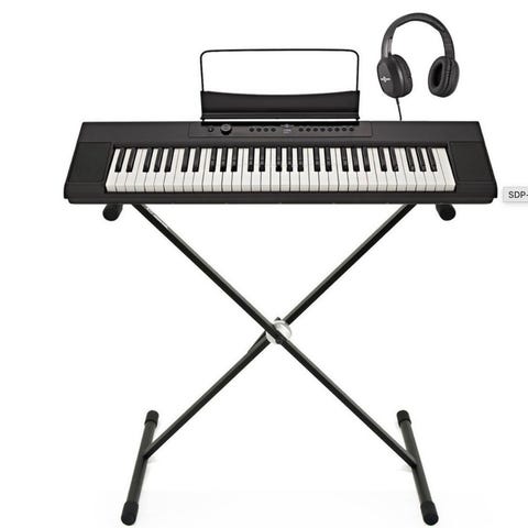 Electronic keyboard with 61 keys. The keyboard has a built-in 3 step learning system and MP3 player USB. The keyboard works on mains power with the supplied adapter but can also be used on-the-go on 6 AA batteries (not supplied). Three 3.5mm Jacks for mic, line aux pc mac cd dvd, headphone or line out to external sound system.