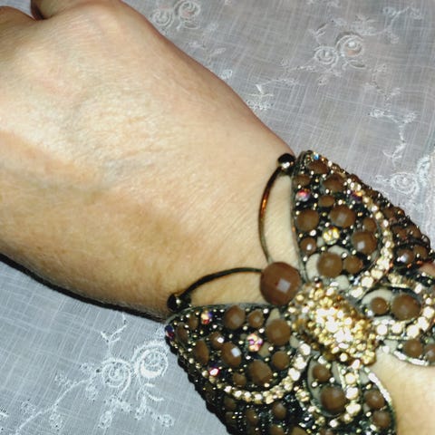 Metallarmbånd med mange emaljerte metallfigurer og acryldetaljer.
