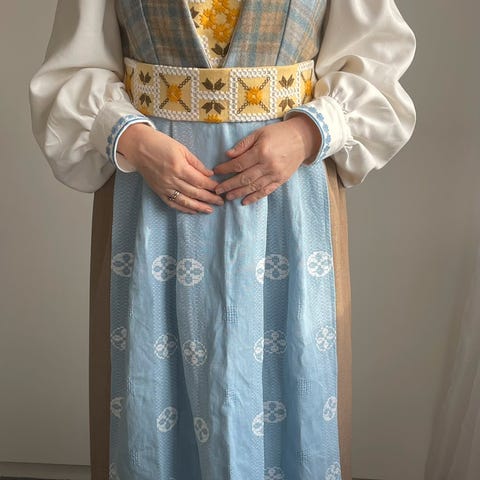 Drakten er av høy kvalitet 100% merinoull fra Gudbrandsdalens Uldvarefabrik. Stakken er sydd fast til livet.