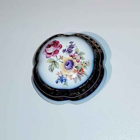 Søt liten dekorert smykkeskrin/ miniaturkomode av tre, med 6 skuffer. Størrelsen (B)22 x (H)18,5 x (D)7,8 cm