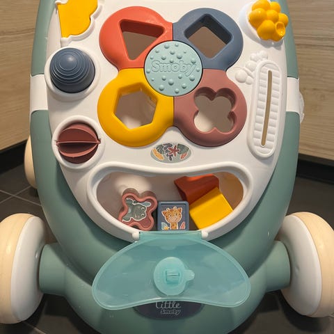 En lys og solid vogn. Denne vogna er full av læringsaktiviteter, for eks form sorter, telle perler og flip fliser. Det er rikelig med plass til å lagre andre leker. Kan til og med brukes til å transportere leker. Lakkert med giftfri maling.