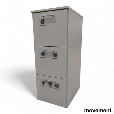 Skapet består av 1 stk stort og 4 stk mindre rom, har god ventilasjon, opphengskroker for langkost og kluter, samt 2 stk hengslede slagdører med sentral 3-punkts sylinderlås (inkl. 2 nøkler) for god sikring.