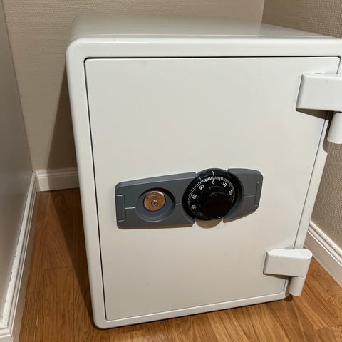 Skapdør innehar elektronisk kodelås inkl. solid håndtak, og innvendig består innredningen av justerbare hyller og/eller låsbar skuff for lagring av mindre verdigjenstander.