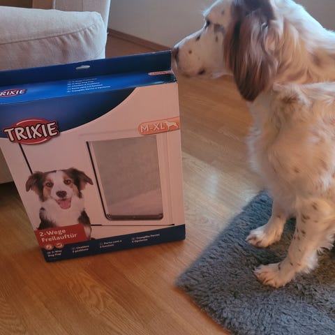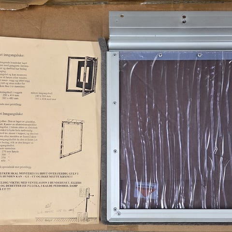 veldig enkel å montere. Tre skruer i toppen. Den blir tett, trekkfri og lydløs. Den bør monteres slik at det blir en terskel slik at hunden