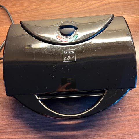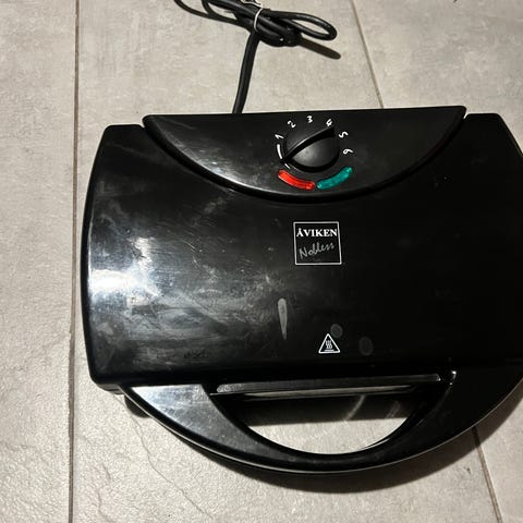 Dobbelt Åviken-jern med stekeplater i teflonbelagt aluminium. Vaffeljernet har håndtak i plast så du ikke brenner deg under stekingen, samt indikatorlys som varsler at vaffelen er ferdig. Jernet yter 1650W