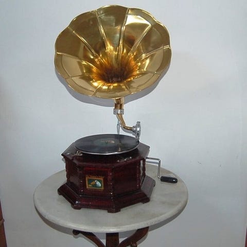 Dekorativ tetro grammofonen spiller bare musikken på vinylopptaket (ikke-flyttbart) som følger med (lavkvalitetslyd).