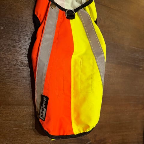 Tofarget gul/oransje GPS-vest. Spesielt designet til kortbente drivende hunder, som dachs, drever og beagle.