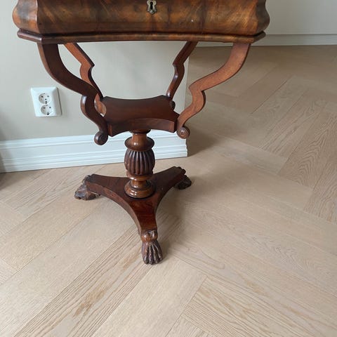et gennemført senempiresybord i håndpoleret mahogni.Lige gennemgået af mahognisnedker for at rette småfejl.Er fuldt udstyret med alverdens sy og strikke grej fra den forrige ejer,