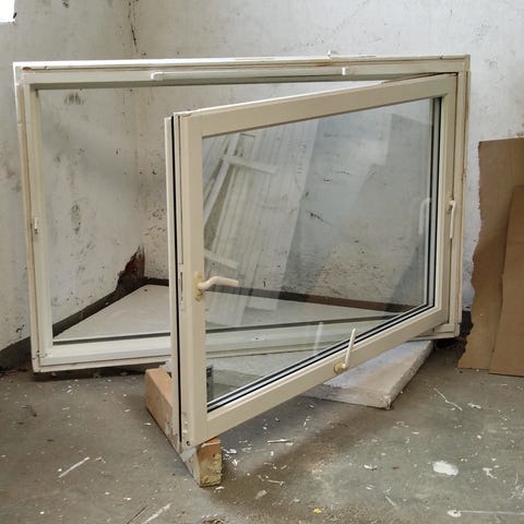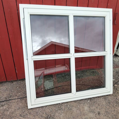 GEALAN PVC sving vinduer - svings 90 grader, hvitt håndtak nederst, 6 stk., 2 lags glass, uten sprosser.