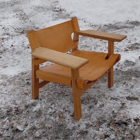 En verdens mest ikoniske lenestol i såpet eik og kjernelær fra Fredericia. Dette er den ettertraktede originale første versjonen med 2 stag på baksiden, tegnet 1958.