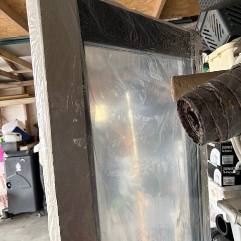 Verandadør utadslående med håndtak og lås på begge sider, helglasset.