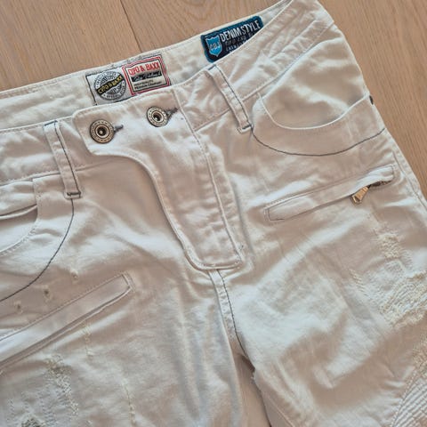 Eksklusiv lyseblå jeansshorts som går rett over knærne. Slitte detaljer, steinvasket og markante hvite sømmer. Denne finner du kun på RockDenim! To lommer foran på låret. Glidelåsene og den ekstra lille lommen er kun for design. Brodert logoskrift på høyre lår og bak. "Magic of denim" brodert på høyre baklomme. To lommer bak og to lommer bak. Knapper i gylfen.