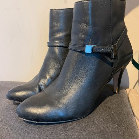Nydelige spisse ankelstøvletter fra Violeta by Mango i sort skinn med kitten hæl. Lukking med glidelås på siden. Skoene er nye, kun prøvd på og kommer i original eske. Str. 37.