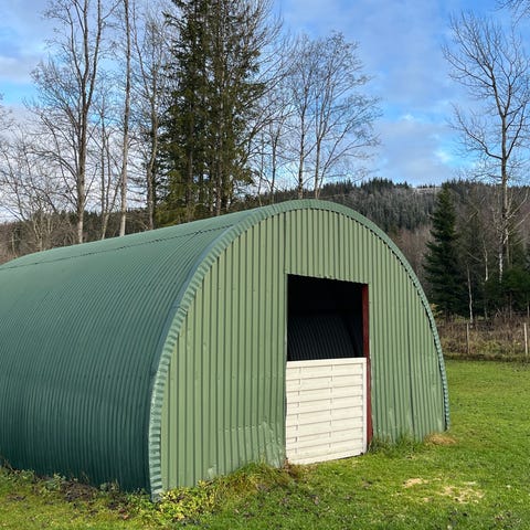 Sauefjøs selges - eksempel på byggesett til en stålhall på 14x30 + 4,5x1,75 meter med frakt og montering. Andre størrelser kan også produseres etter mål.