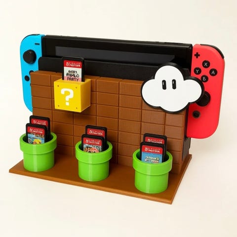 Veggfeste til Nintendo Switch i "Super Mario Castle" stil. Festet har plass til fem spillkort for enkel og rask lagring. Kan kjøpes i vår nettbutikk. I skrivende stund tilbyr vi kun i fargen svart, vi har sluttet å produsere dette produktet i brun farge. Priser fra 249,-