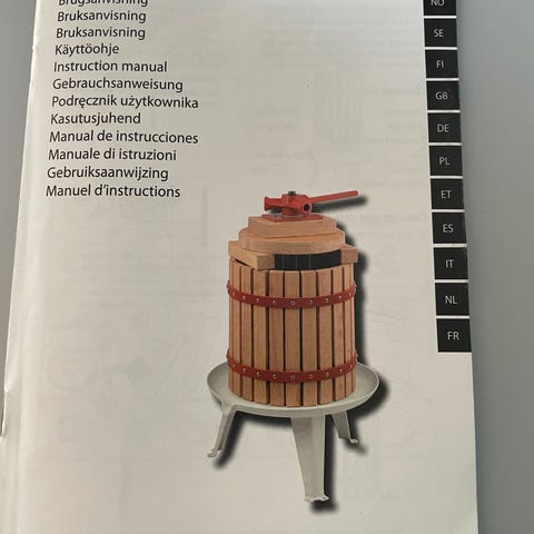 Fruktpresse i stål og tre til fremstilling av juice, cider og saft av fruktmos eller bær. Beholderkapasitet: 12 liter.