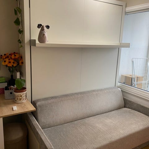 En solid sengeramme av jern med fjærbelastning for enkelt å løfte sengen opp mot veggen. Montert rett på gulv kan sengen enkelt skjules bak gardiner,persienner, osv., eller monteres i skap.