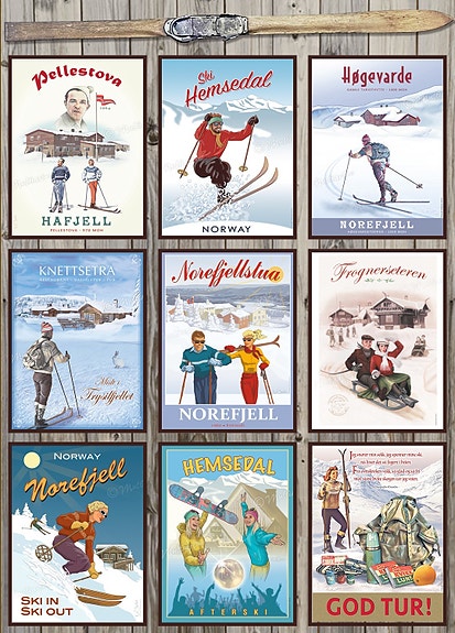 Stikkord: Norefjell, Fjellhytte, Hytte interiør, Hytteliv, Gamle skiplakater, Retro reklameplakater, Ski poster, Hyttepostere