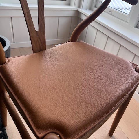 Skinnputer til Y-stolen, CH24 (eller Wishbone Chair som den også kalles) av Hans J. Wegner. Putene er ubrukte, i skinn, og vi har dem i tre farger nå; cognac, mørkebrun og sort. Putene er ca 3 cm tykke, og er formsydde til stolen. Puten gjør stolen enda mer komfortabel og tar vare på seteflettingen.
