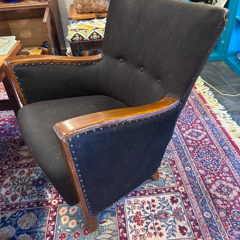 Profesjonelt stoppet og trukket i nyere tid i blå silkebrokade. Enkelte bruksspor, noe slitasje på det ene armlenet, se bilde. Ellers i meget god stand. Trukket også over hele ryggpartiet, den kan derfor stå fritt i rommet. Komfortabel.
