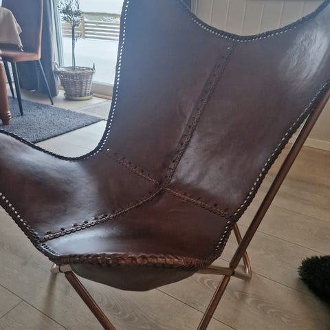 Vår sommerfuglstol i gammeldags stil i ekte lær har blitt ergonomisk designet for full avslapning etter en travel dag. Det ikoniske sommerfugldesignet er veldig populært og passer til enhver innredning.