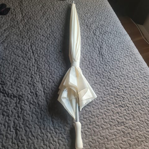 Klassisk ren, stor kvalitets brudeparaply fra VOGUE. Brudeparaplyene til VOGUE er som alle andre paraplyer fra VOGUE av meget høy kvalitet med "Du Pont" teflon belagt duk og er windproof. Det vil si at brudeparaplyen skal kunne vrenge seg i kraftig vind for ikke og bli ødelagt, for så og kunne vendes tilbake. Denne brudeparaplyen har aluminiums ramme og spiler. Brudeparaplyen har auto åpning. Gjør seg godt på bilder, praktisk i sterk sol, og når man er uheldig med været på den store dagen. Stor nok til to.