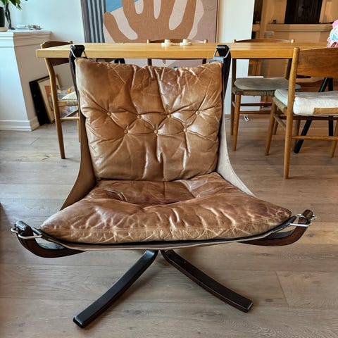 Ett eksemplarer av den ikoniske skinnstolen Falcon designet av Sigurd Ressel for Vatne møbler. Stolen er i palisander-beiset laminert bøk med pute i brunt skinn. Dette er versjonen med lav rygg. Puten er i god stand med alle knapper, men hempene øverst på putene som skal feste puten til canvaset er revet av, dette har ingenting å si for bruken. Rammen er hel og tight, er vokset, men har noe slitasje. Canvaset som henger på rammen er også hel og fungerende, men har blitt solbleket. En funksjonell og pen stol med patina og historie.