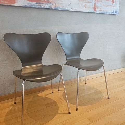 6 stk Arne Jacobsen. model 3107 ''Syveren fuldpolstret sort semianilin skinn. Alle understel er polert opp, tilført nye sko og nye sete dempere, stolene er restaurert på fabrikken i Danmark. Stolene er som ''nye''