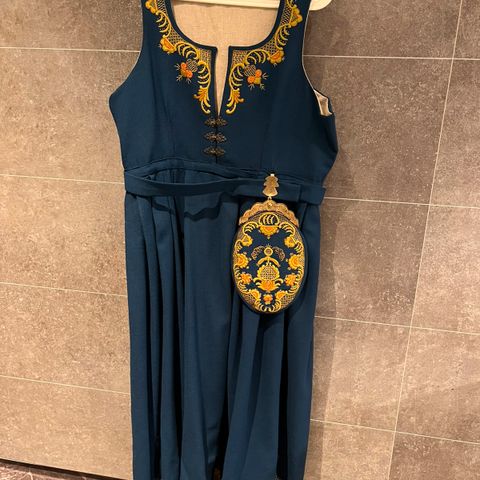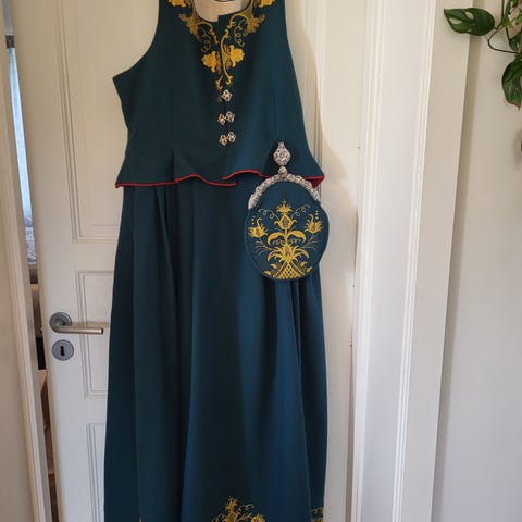 Vi har en helt NY ferdigstillt bunad i str. 38-40 (kan syes inn og ut )i grønn farge og en bunad i str. 36 i blå farge. Bunad med lin (bomull eller strykefri)skjorte og veske koster kr 27999.