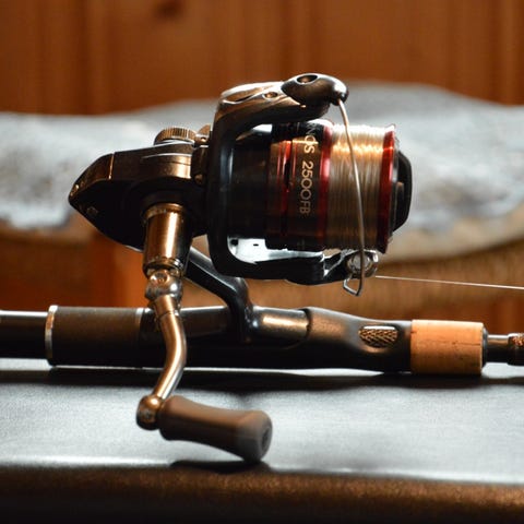 Laksestang med haspelsnelle, sene, sluk m.m.