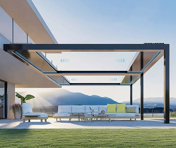 Motorisert Zip-Screen solskjerming.Tåler mye vind.