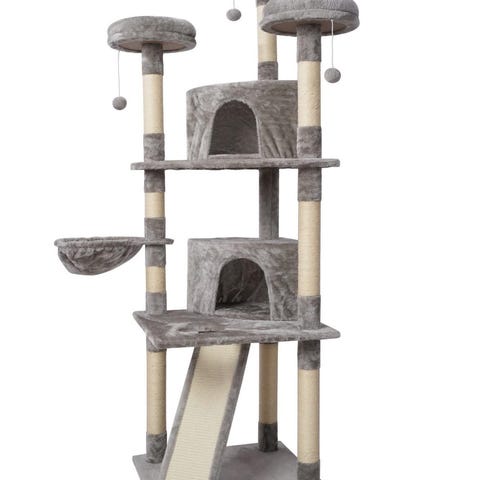 Dine kattevenner kan skarpe klørne på klorestolpene som er dekket i sisaltau, noe som gir et sunt utløp for deres kloreinstinkter. De vil også like å jage hverandre mens de hopper opp og ned i dette morsomme lekelandet. Når de har fått nok lekemoro, vil de små vennene dine elske å hvile på de øvre plattformene hvor de har en bedre utsikt. De kan også gjemme seg i det koselige huset for en liten lur. Det er egnet for kattunger.