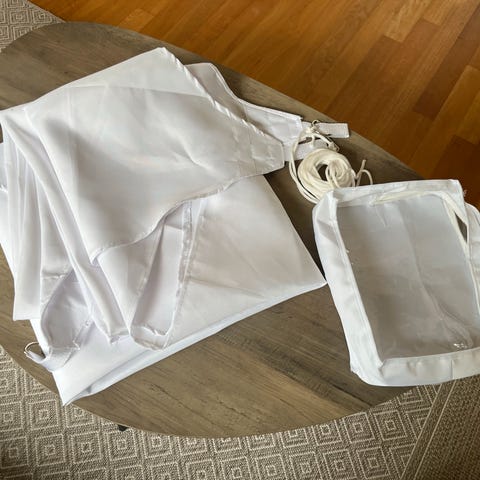 Materialet er 180gr polyester. Duk i krafig, impregnert holdbar kvalitet. Kraftige kroker i hvert hjørne for enkelt oppheng.