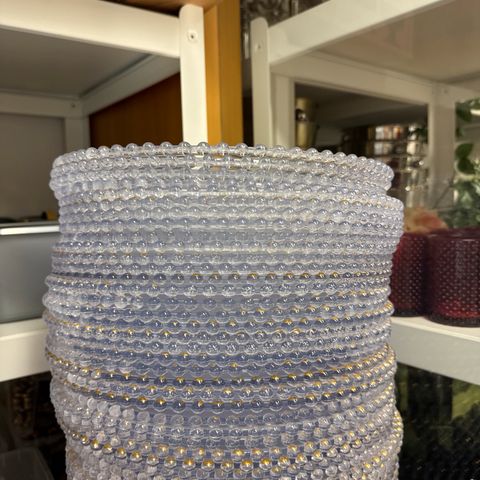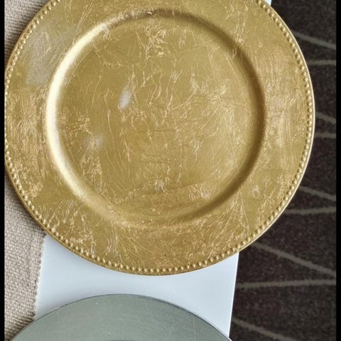 Dekketallerkner i glass med gullkant! Kr 39 pr stk i leie