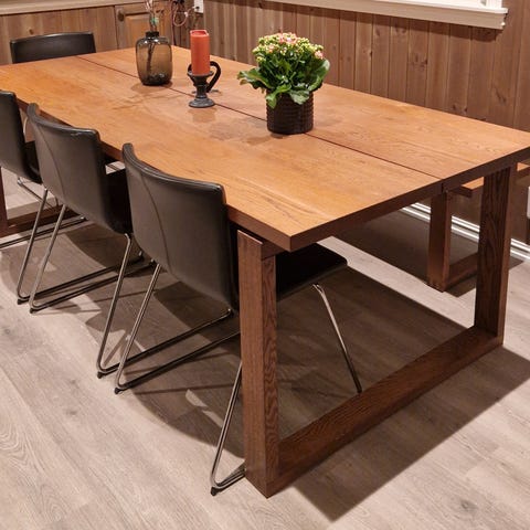 Eik Landlig langbord har en spesiell vakker og rustikk vedstruktur som gir et unikt fargespill. Her benytter vi massive vintage/rustikk eike materialer med kvist og sprekkdannelser. Langbordene har et kraftfullt uttrykk med sin rustikke plate av massiv vintage eik og solide massive bordben av samme materiale. De massive eikematerialene gir eikebordene en adskillig høyere vekt enn våre bordmodeller i furu materiale.