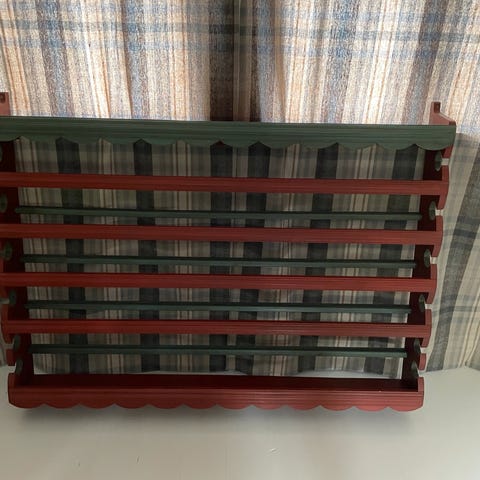 Solid hylle i metall med malte treplater som hyller.