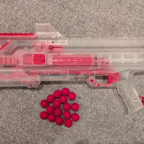 Denne modellen har batteriet integrert. For å få ladet batteriet må du skyve ut platen i bunnen av håndgrepet for å koble til USB-Kabelen. Denne skyter rundt 8-10 skudd i sekundet. Pistolen er super enkel å bruke og passer til spill både inne og ute - Morsomt for de aller fleste!