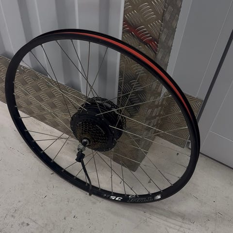 Den har skivebremser foran og bak, 8 gir Sram X5 gir.