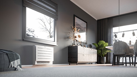 Fleksibel plassering: Bosch Climate varmepumpe unike yttermål gjør at den kan plasseres nesten hvor som helst. F.eks. over en døråpning for å gi luften fri passasje mellom ulike rom der den gir den beste luftspredningen.