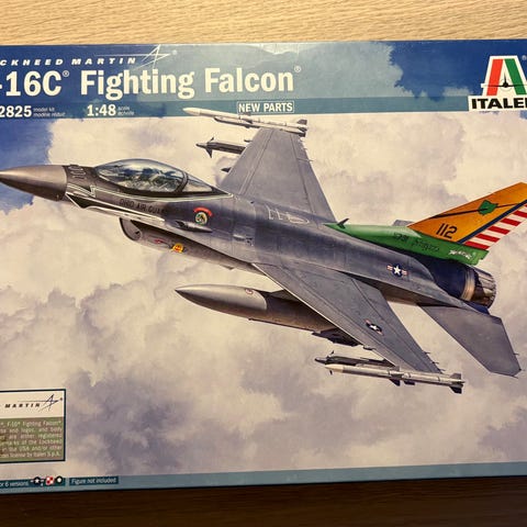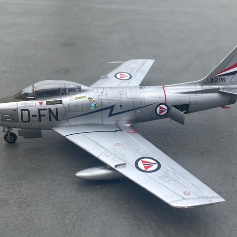 Airfix byggesett av North American F-86F-40 Sabre i skala 1/48. Inneholder 156 deler. Følger med dekaler for norsk utgave fra oppvisningteamet The Flying Jokers, 332 skvadronen, luftforsvaret, Rygge, 2. juni 1962.