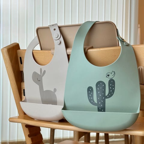 Praktisk silikonsmekke med matoppsamler. Silikon er slitesterkt og er enkelt å tørke av eller vaske i oppvaskmaskinen. Smekken er myk og komfortabel for de små å bruke, har justerbar nakkestropp.