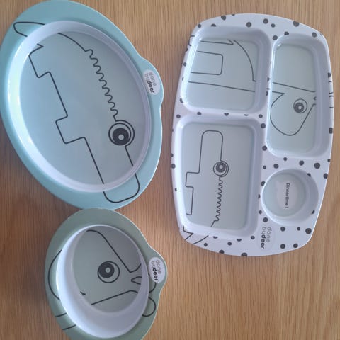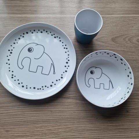 Et spisesett / barneservise fra Done by Deer som gjør måltidene litt morsommere! Settet inneholder en skål, en tallerken, et lite glass og en vanntett smekke. Perfekt som gave. Glasset og smukken er eksklusivt for dette settet.