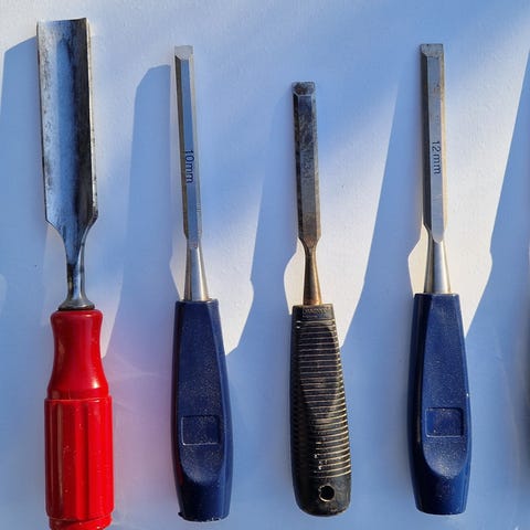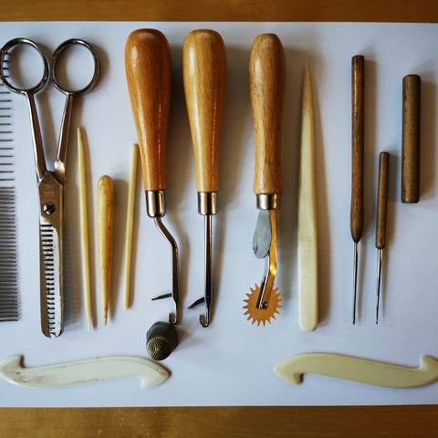 Kniver, slynger, skinner, varmebestandige hansker og masse annet verktøy til keramikk.